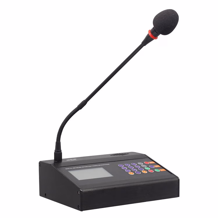 The IP‑8200PG is a high-end desktop paging microphone designed for use in IP-based public address (PA) systems. Featuring a sleek aluminum alloy housing and a 3.5″ LCD touchscreen, it supports two-way intercom, SIP-style paging, and robust network audio control.