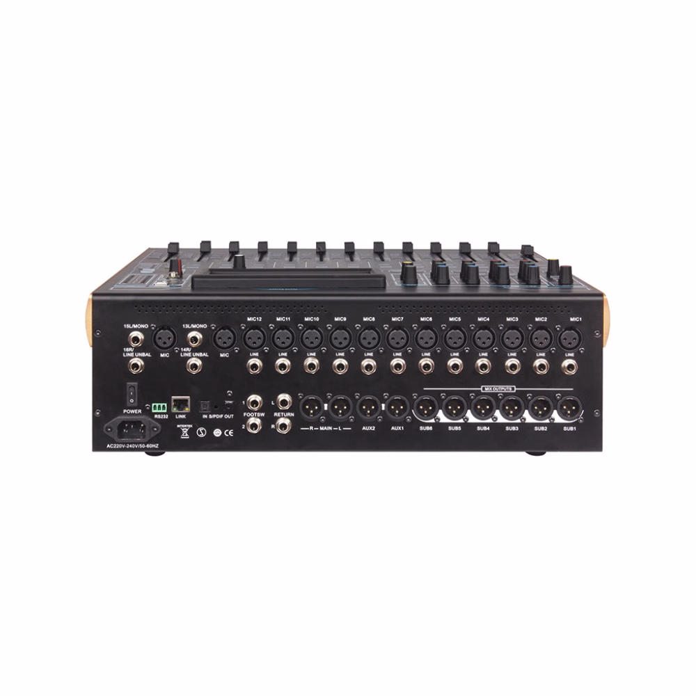 • 20 channel signal input (12 channel MIC input, two groups of stereo input, one group of return input, one group of digital input: sound card /mp3, optical fiber input)